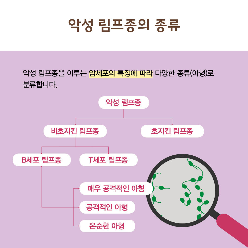 혈액암에는 백혈병, 악성 림프종, 다발성골수종이 있습니다. 그 중 악성 림프종은 인체의 면역체계인 림프계 조직 세포가 악성으로 과다증식하는 질환으로, 전이가 빠르게 이루어질 수 있습니다. 악성 림프종은 크게 비호지킨과 호지킨으로 나눌 수 있는데, 우리나라에서는 비호지킨 림프종의 발병 비율이 더 높습니다.