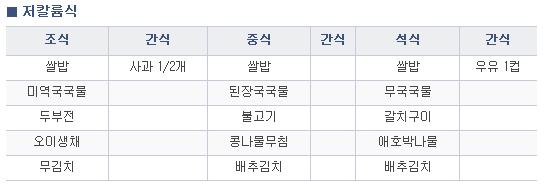 잡곡밥, 현미밥, 현미, 수수, 고구마, 감자,밤, 미나리, 단호박, 시금치, 아욱, 키위, 토마토, 바나나, 참외, 메론, 과일즙 등