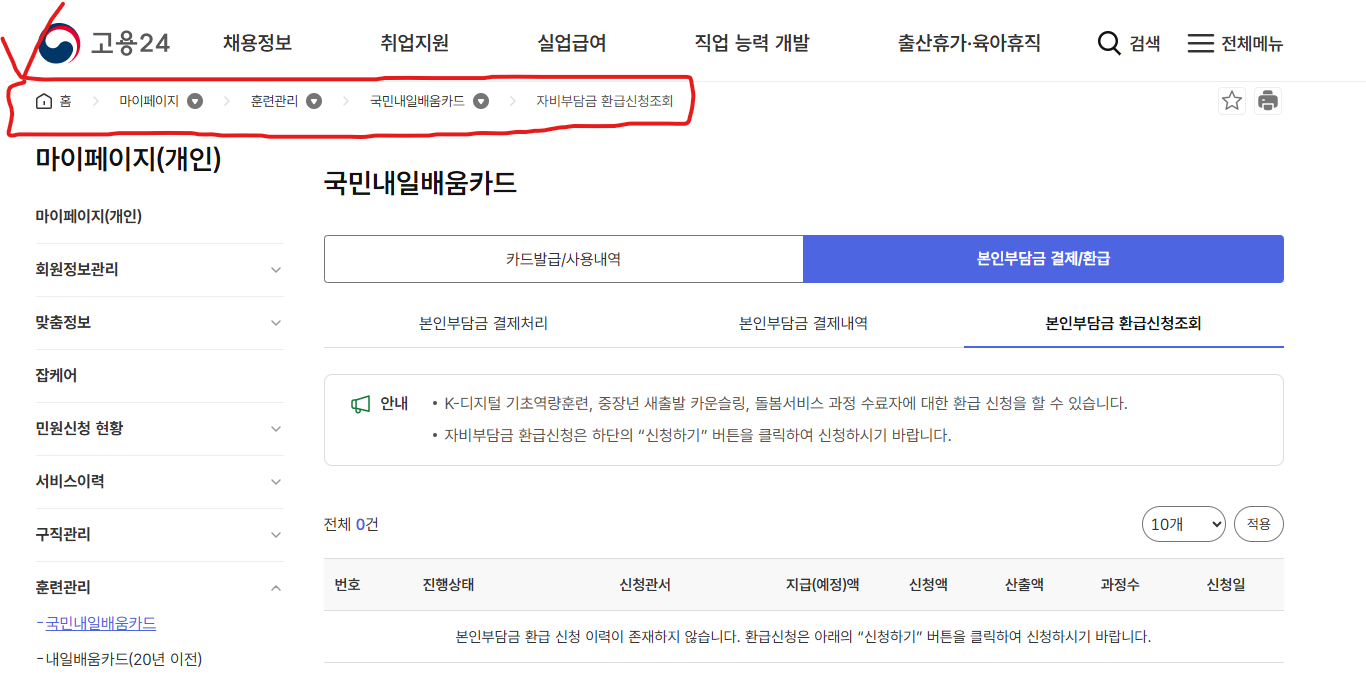 ➕고용24 웹/앱 로그인 > 마이페이지 > 훈련관리 > 자비부담금 결제/환급 > 신청