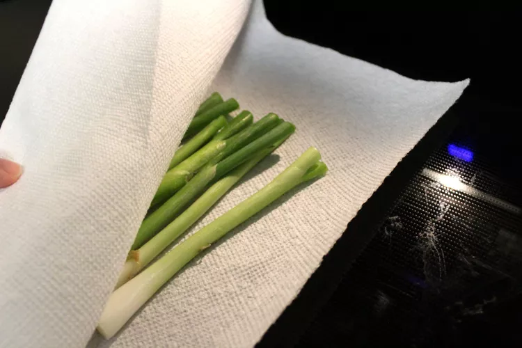 종이 타월을 사용하여 파를 두드려서 과도한 수분을 제거합니다.